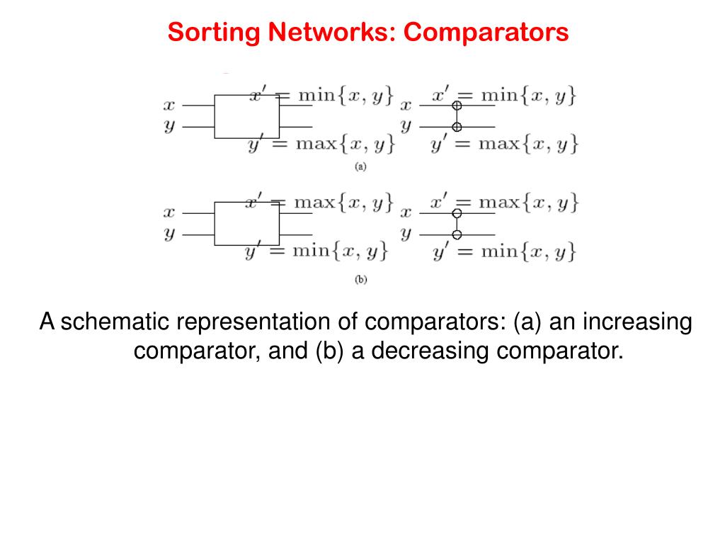 Sorting Networks: Comparators A schematic representation of comparators: (a) an increasing comparator, and (b) a decreasing comparator.