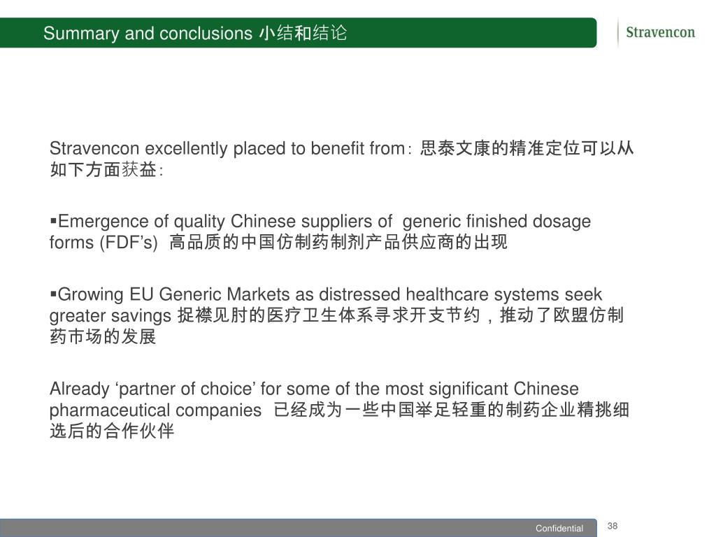 Summary and conclusions 小结和结论 Stravencon excellently placed to benefit from: 思泰文康的精准定位可以从如下方面获益: Emergence of quality Chinese suppliers of generic finished dosage forms (FDF’s)高品质的中国仿制药制剂产品供应商的出现 Growing EU Generic Markets as distressed healthcare systems seek greater savings 捉襟见肘的医疗卫生体系寻求开支节约,推动了欧盟仿制药市场的发展 Already ‘partner of choice’ for some of the most significant Chinese pharmaceutical companies 已经成为一些中国举足轻重的制药企业精挑细选后的合作伙伴