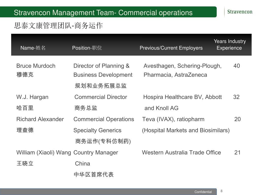 Stravencon Organigramme 思泰文康组织机构图表 CEO首席执行官 Douglas Andrews 安达格 Country Manager China中华区首席代表 William Wang 王晓立 Finance & Admin财务和行政 Julian Attfield 朱利安 Operations & Procurement团体采购及运作总监 David Bilton 毕大伟 Business Development业务拓展 Bruce Murdoch 穆德克 European Commercial欧盟商务 Bill Hargan 哈百里 Technical Director技术首席 Dr Alvaro Espina 奥维罗 Regulatory & Tech Doc药政和文件 Andy Pickbourne皮安迪 QA ManagementQA管理 David Clapperton QP’科大维(QP) Safety & PV 安全和药物检测 Dr Graeme Ladds蓝格木