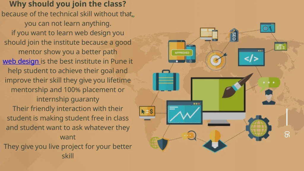 Whyshouldyoujointheclass? becauseofthetechnicalskillwithoutthat,, youcannotlearnanything. ifyouwanttolearnwebdesignyou shouldjointheinstitutebecauseagood mentorshowyouabetterpath webdesignisthebestinstituteinPuneit helpstudenttoachievetheirgoaland improvetheirskilltheygiveyoulifetime mentorshipand100%placementor internshipguaranty Theirfriendlyinteractionwiththeir studentismakingstudentfreeinclass andstudentwanttoaskwhateverthey want Theygiveyouliveprojectforyourbetter skill 05