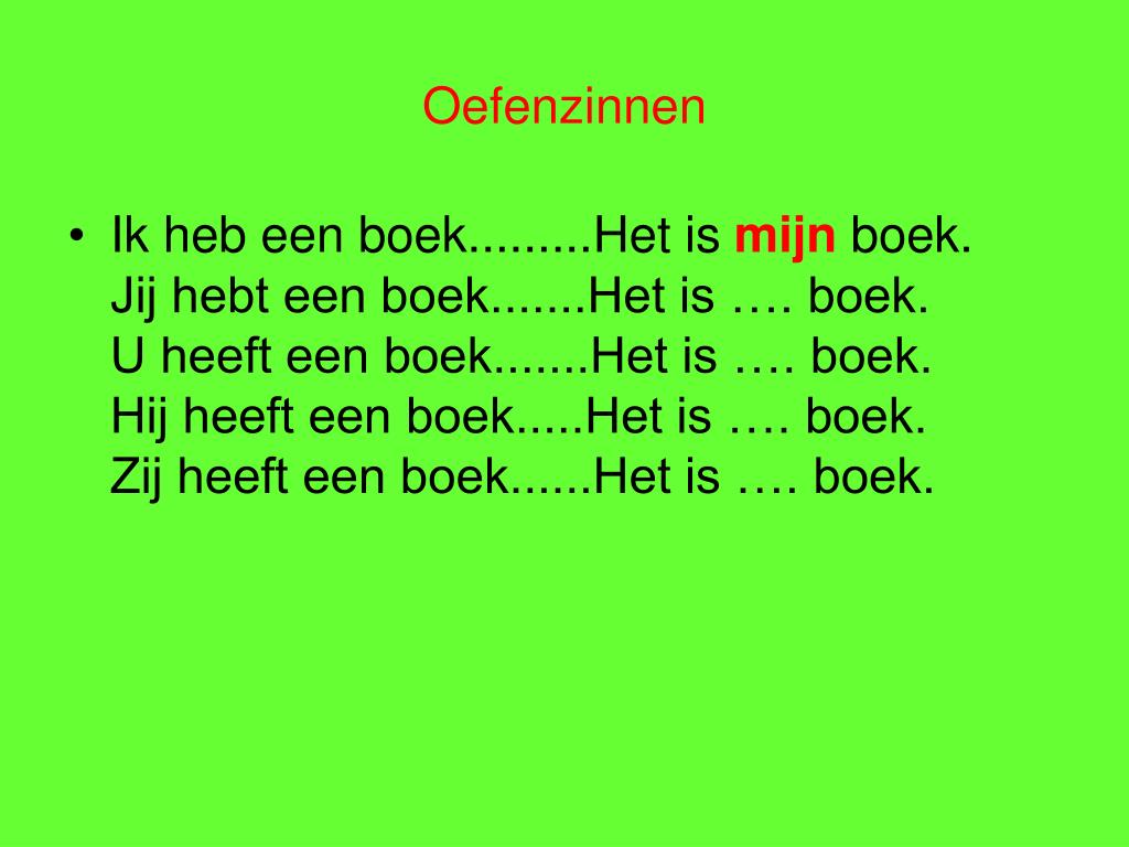 Oefenzinnen • Ik heb een boek.........Het is mijn boek.Jij hebt een boek.......Het is …. boek.U heeft een boek.......Het is …. boek.Hij heeft een boek.....Het is …. boek.Zij heeft een boek......Het is …. boek.