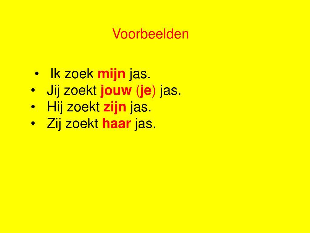 Voorbeelden • Ik zoek mijn jas.• Jij zoekt jouw (je) jas.• Hij zoekt zijn jas.• Zij zoekt haar jas.