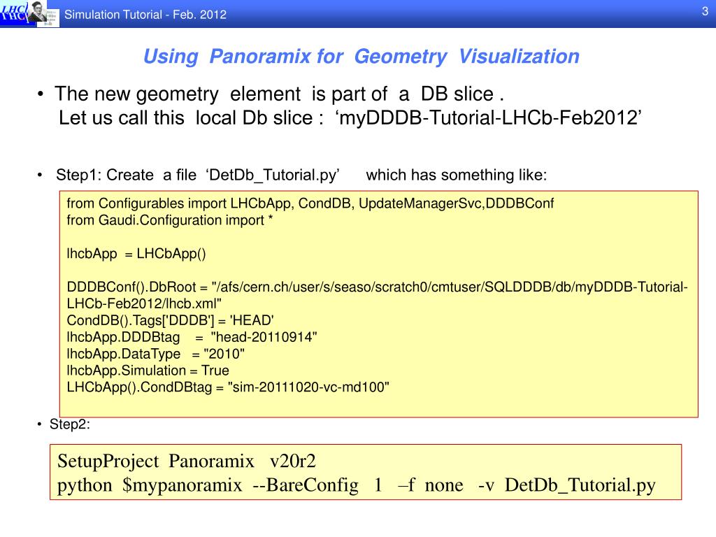 Using Panoramix for Geometry Visualization • The new geometry element is part of a DB slice . • Let us call this local Db slice : ‘myDDDB-Tutorial-LHCb-Feb2012’ • Step1: Create a file ‘DetDb_Tutorial.py’ which has something like: from Configurables import LHCbApp, CondDB, UpdateManagerSvc,DDDBConffrom Gaudi.Configuration import *lhcbApp = LHCbApp()DDDBConf().DbRoot = "/afs/cern.ch/user/s/seaso/scratch0/cmtuser/SQLDDDB/db/myDDDB-Tutorial-LHCb-Feb2012/lhcb.xml"CondDB().Tags['DDDB'] = 'HEAD'lhcbApp.DDDBtag = "head-20110914"lhcbApp.DataType = "2010"lhcbApp.Simulation = TrueLHCbApp().CondDBtag = "sim-20111020-vc-md100" • Step2: SetupProjectPanoramix v20r2 python $mypanoramix --BareConfig 1 –f none -v DetDb_Tutorial.py