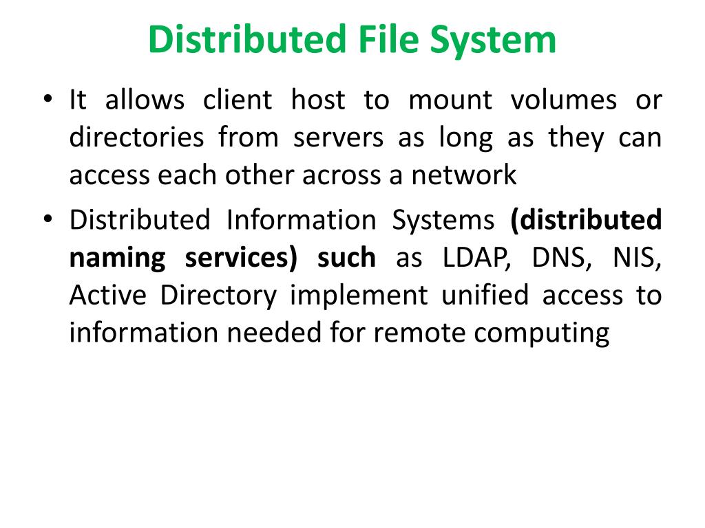 Distributed File System • It allows client host to mount volumes or directories from servers as long as they can access each other across a network • Distributed Information Systems (distributed naming services) such as LDAP, DNS, NIS, Active Directory implement unified access to information needed for remote computing