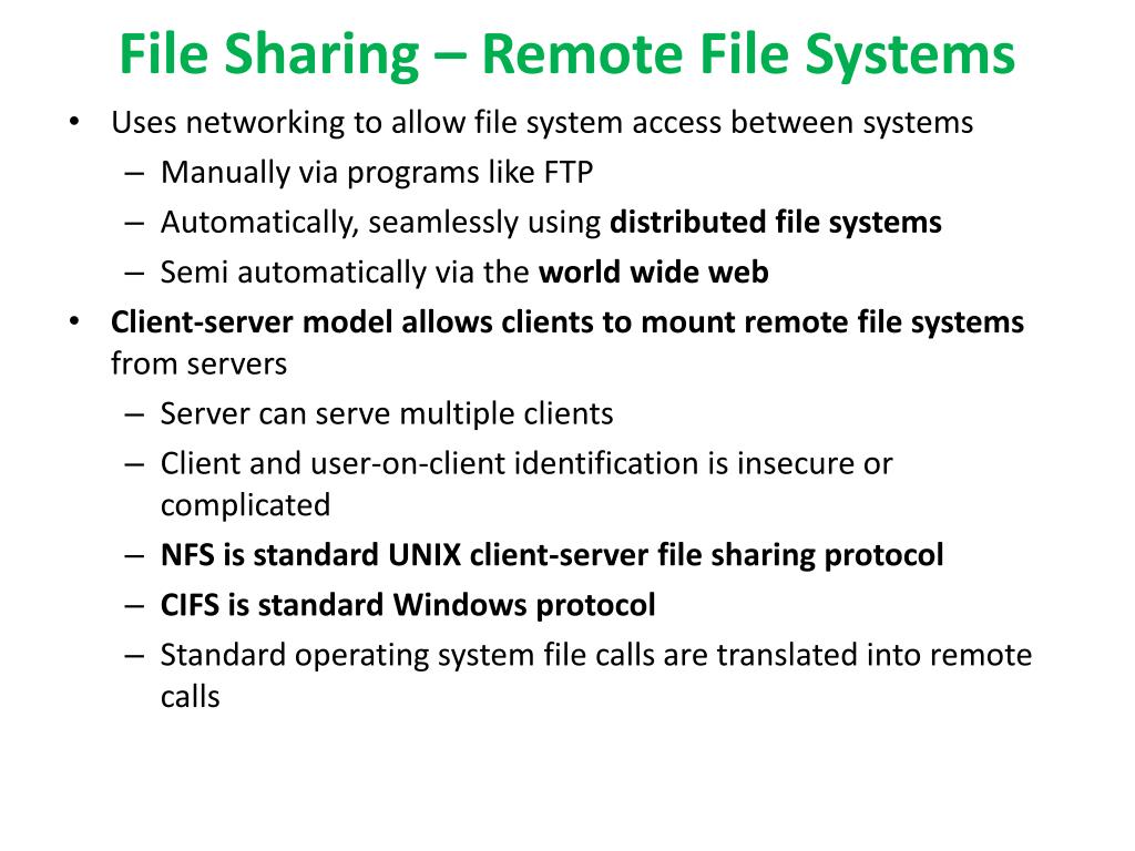 File Sharing – Remote File Systems • Uses networking to allow file system access between systems • Manually via programs like FTP • Automatically, seamlessly using distributed file systems • Semi automatically via the world wide web • Client-server model allows clients to mount remote file systems from servers • Server can serve multiple clients • Client and user-on-client identification is insecure or complicated • NFS is standard UNIX client-server file sharing protocol • CIFS is standard Windows protocol • Standard operating system file calls are translated into remote calls
