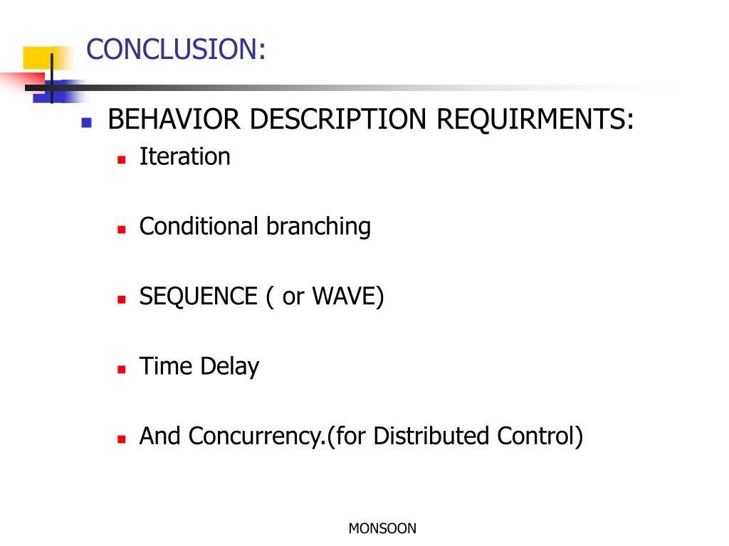 CONCLUSION: • BEHAVIOR DESCRIPTION REQUIRMENTS: • Iteration • Conditional branching • SEQUENCE ( or WAVE) • Time Delay • And Concurrency.(for Distributed Control) MONSOON