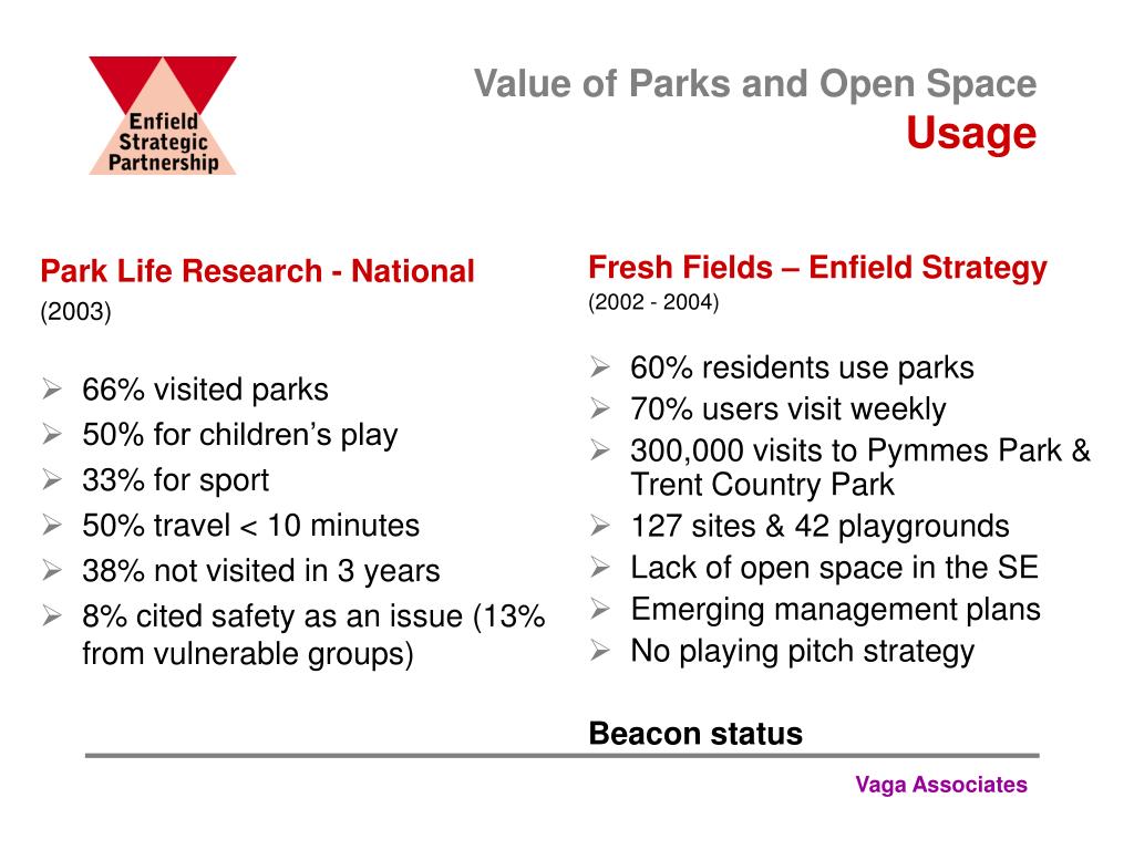 Park Life Research - National (2003) 66% visited parks 50% for children’s play 33% for sport 50% travel < 10 minutes 38% not visited in 3 years 8% cited safety as an issue (13% from vulnerable groups) Fresh Fields – Enfield Strategy (2002 - 2004) 60% residents use parks 70% users visit weekly 300,000 visits to Pymmes Park & Trent Country Park 127 sites & 42 playgrounds Lack of open space in the SE Emerging management plans No playing pitch strategy Beacon status Value of Parks and Open SpaceUsage
