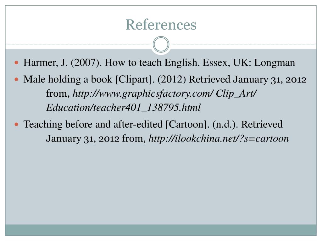 References • Harmer, J. (2007). How to teach English. Essex, UK: Longman • Male holding a book [Clipart]. (2012) Retrieved January 31, 2012 from, http://www.graphicsfactory.com/ Clip_Art/ Education/teacher401_138795.html • Teaching before and after-edited [Cartoon]. (n.d.). Retrieved January 31, 2012 from,http://ilookchina.net/?s=cartoon
