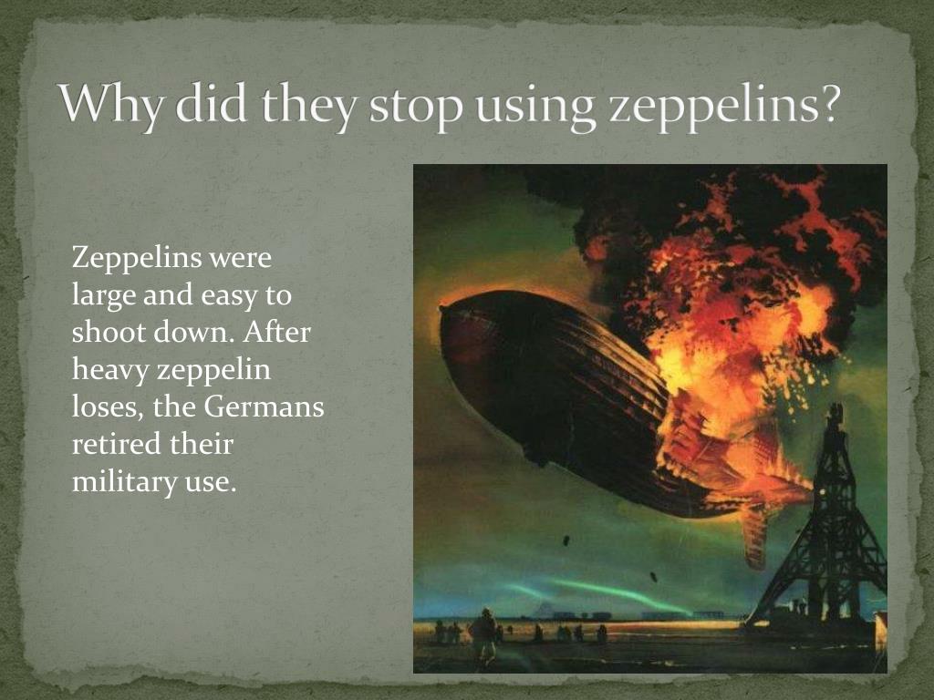 Why did they stop using zeppelins? Zeppelins were large and easy to shoot down. After heavy zeppelin loses, the Germans retired their military use.