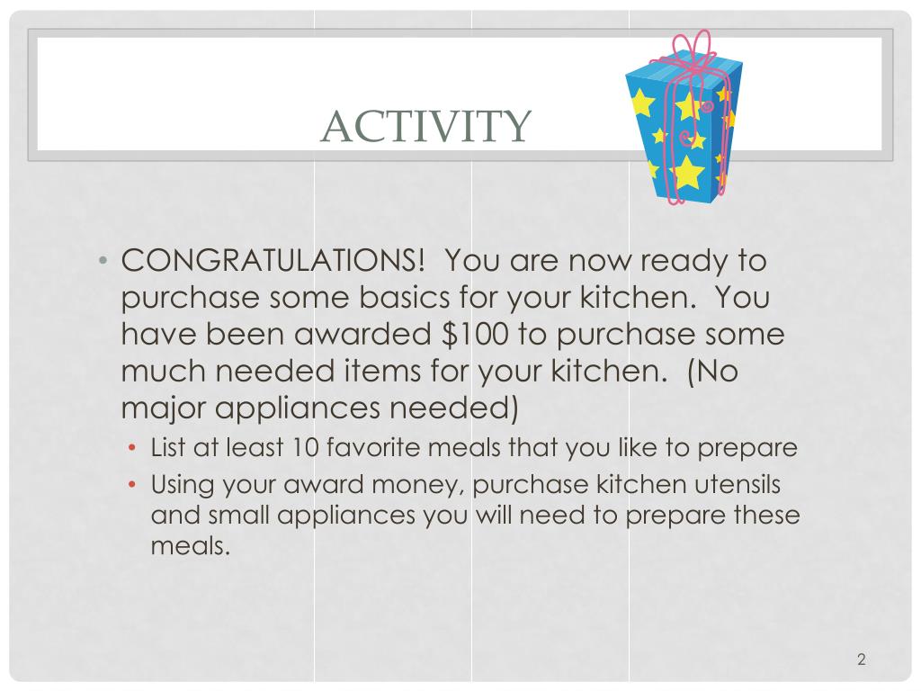 2. Activity • CONGRATULATIONS! You are now ready to purchase some basics for your kitchen. You have been awarded $100 to purchase some much needed items for your kitchen. (No major appliances needed) • List at least 10 favorite meals that you like to prepare • Using your award money, purchase kitchen utensils and small appliances you will need to prepare these meals.