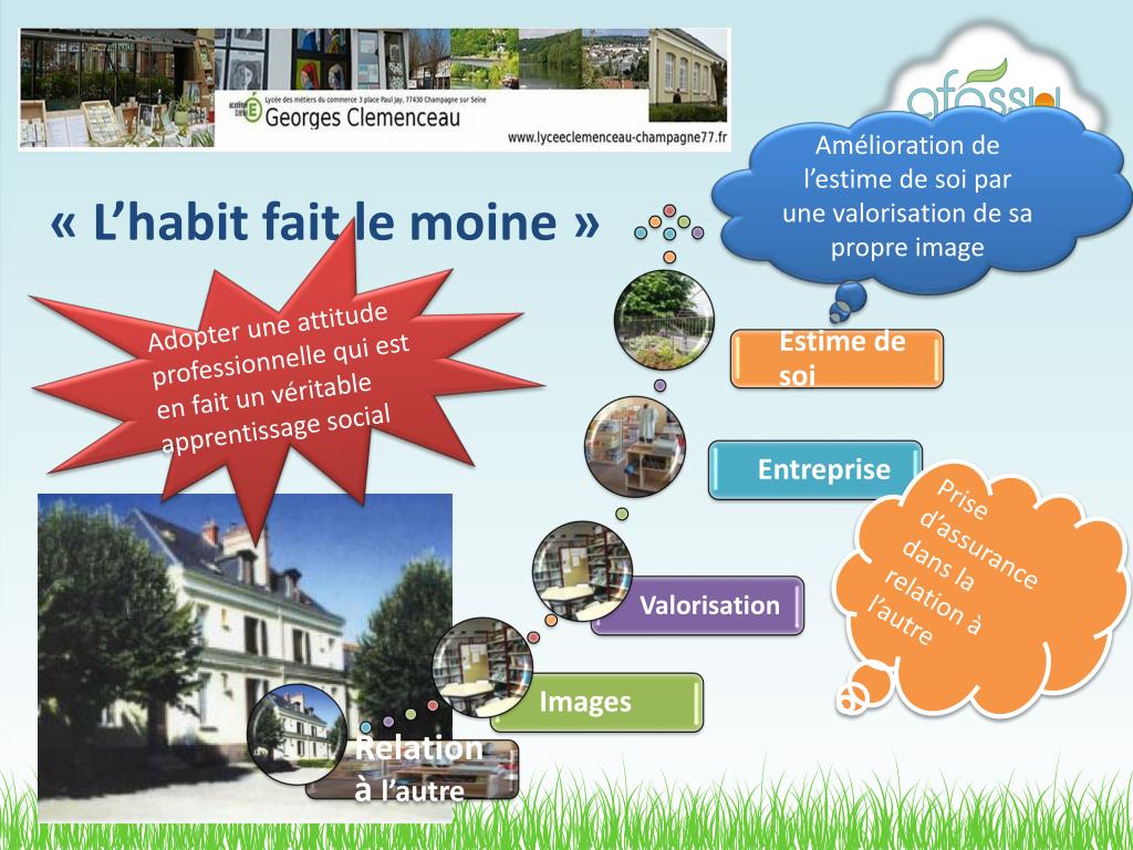 Amélioration de l’estime de soi par une valorisation de sa propre image « L’habit fait le moine » • Adopter une attitude professionnelle qui est en fait un véritable apprentissage social • Prise d’assurance dans la relation à l’autre
