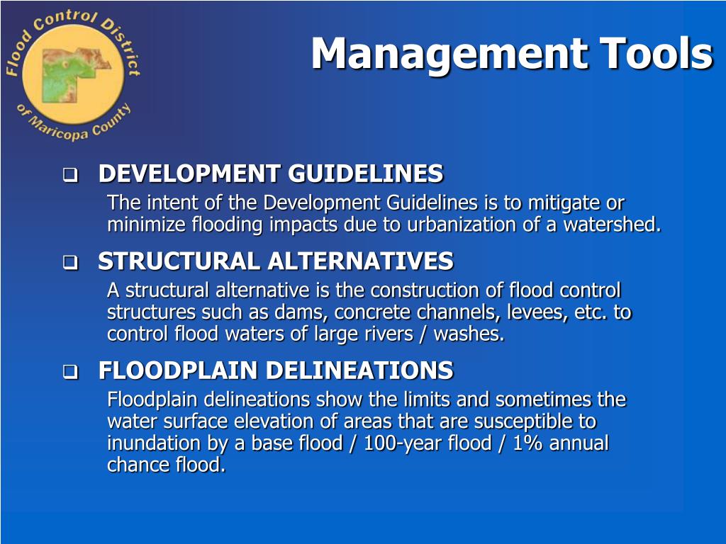 Management Tools • DEVELOPMENT GUIDELINES The intent of the Development Guidelines is to mitigate or minimize flooding impacts due to urbanization of a watershed. • STRUCTURAL ALTERNATIVES A structural alternative is the construction of flood control structures such as dams, concrete channels, levees, etc. to control flood waters of large rivers / washes. • FLOODPLAIN DELINEATIONS Floodplain delineations show the limits and sometimes the water surface elevation of areas that are susceptible to inundation by a base flood / 100-year flood / 1% annual chance flood.