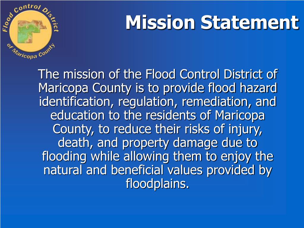 Mission Statement The mission of the Flood Control District of Maricopa County is to provide flood hazard identification, regulation, remediation, and education to the residents of Maricopa County, to reduce their risks of injury, death, and property damage due to flooding while allowing them to enjoy the natural and beneficial values provided by floodplains.