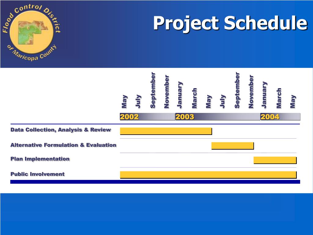 Public Involvement Public invited to express ideas and insights. We invite you to get involved in the problem solving process and to create a community based solution. • 3,000 Brochures and Surveys mailed to the community • Public Meetings will be held throughout the project • Project Website – www.fcd.maricopa.gov • Advertising and Articles will continue in local media • Work Group