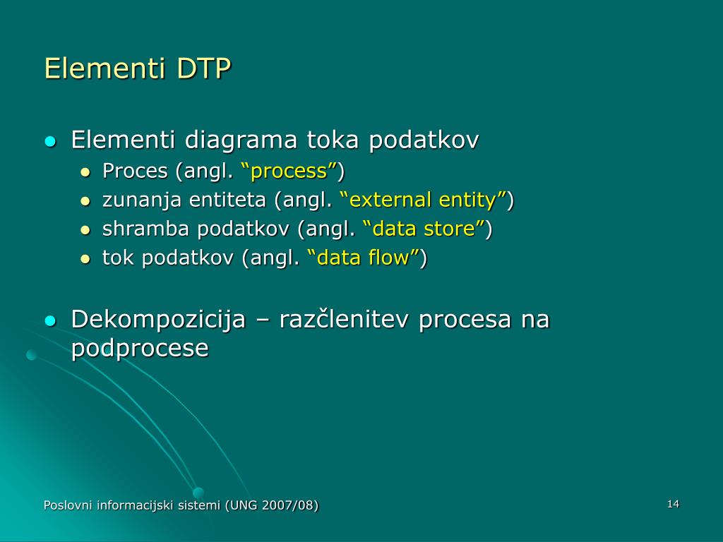 Elementi DTP • Elementi diagrama toka podatkov • Proces (angl. “process”) • zunanja entiteta (angl. “external entity”) • shramba podatkov (angl. “data store”) • tok podatkov (angl. “data flow”) • Dekompozicija – razčlenitev procesa na podprocese Poslovni informacijski sistemi (UNG 2007/08)