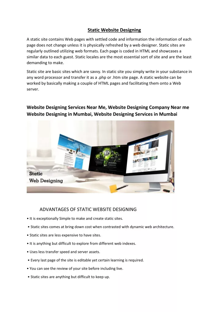 A static site contains Web pages with settled code and information the information of each page does not change unless it is physically refreshed by a web designer. Static sites are regularly outlined utilizing web formats. Each page is coded in HTML and showcases a similar data to each guest. Static locales are the most essential sort of site and are the least demanding to make. Static site are basic sites which are savvy. In static site you simply write in your substance in any word processor and transfer it as a .php or .htm site page. A static website can be worked by basically making a co