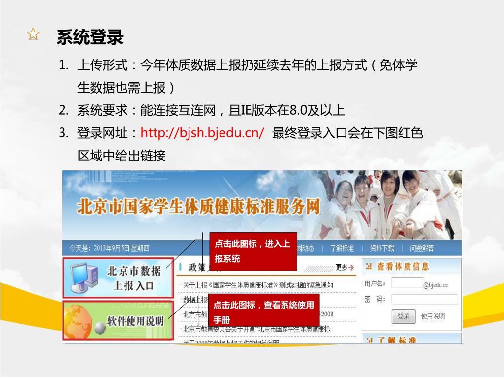 国家学生体质健康标准测试数据与报送系统(北京市). 软件使用说明. 系统登录. 上传形式: 今年体质数据上报扔延续去年的上报方式 (免体学生数据也需上报) 系统要求:能连接互连网,且 IE 版本在 8.0 及以上 登录网址: http://bjsh.bjedu.cn/ 最终登录入口会在下图红色区域中给出链接. 点击此图标,进入上报系统. 点击此图标,查看系统使用手册. 登录页面. 步骤一:在左图红框中输入用户名. 步骤二:在左图红框中输入密码. 用户在输入正确的用户名及密码后,点击提交按钮后即可登录系统. 用户若输入错误的用户名或密码,点击重置按钮,即可从新输入。.