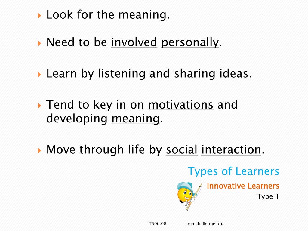 Look for the meaning. • Need to be involvedpersonally. • Learn by listening and sharing ideas. • Tend to key in on motivations and developing meaning. • Move through life by socialinteraction. Types of Learners Innovative Learners Type 1 T506.08 iteenchallenge.org