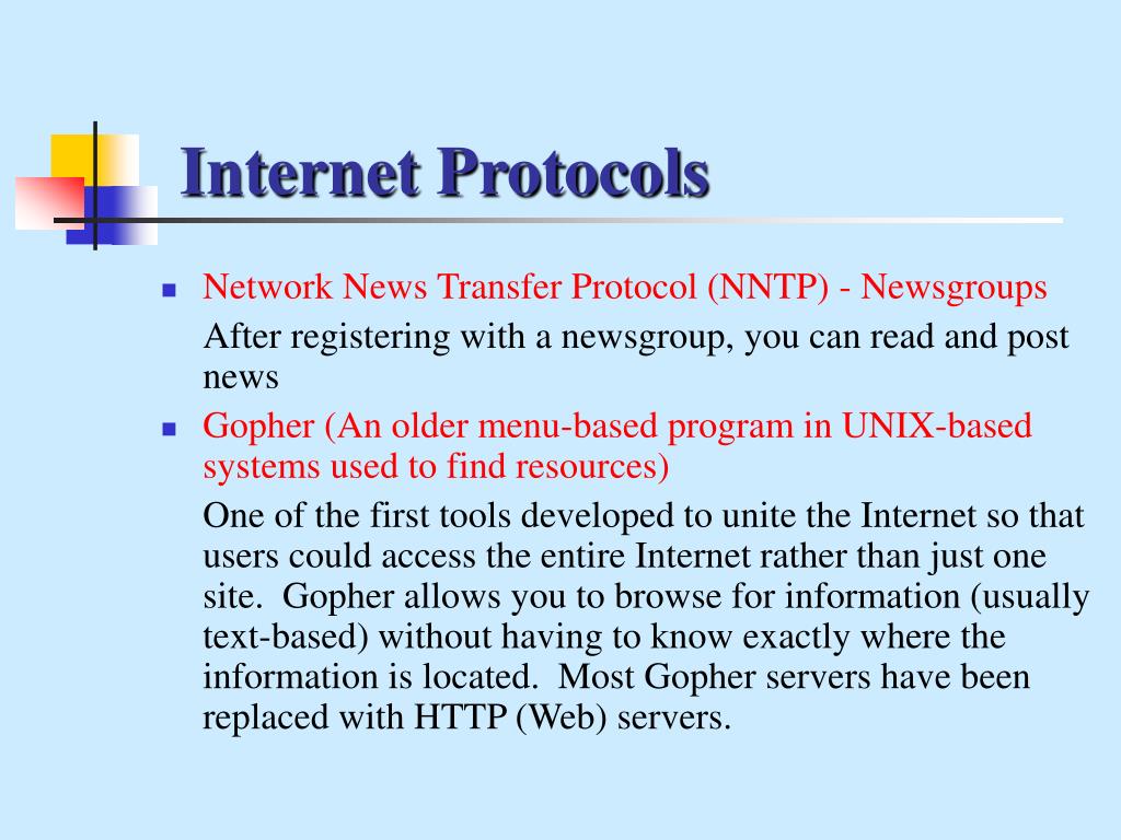 Internet Protocols • Network News Transfer Protocol (NNTP) - Newsgroups After registering with a newsgroup, you can read and post news • Gopher (An older menu-based program in UNIX-based systems used to find resources) One of the first tools developed to unite the Internet so that users could access the entire Internet rather than just one site. Gopher allows you to browse for information (usually text-based) without having to know exactly where the information is located. Most Gopher servers have been replaced with HTTP (Web) servers.