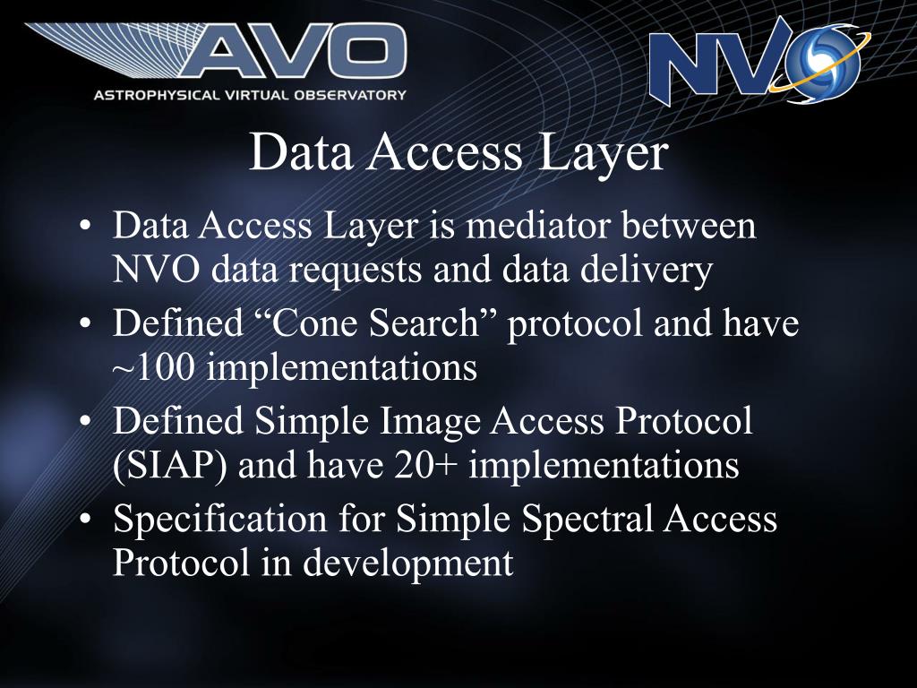 Data Access Layer • Data Access Layer is mediator between NVO data requests and data delivery • Defined “Cone Search” protocol and have ~100 implementations • Defined Simple Image Access Protocol (SIAP) and have 20+ implementations • Specification for Simple Spectral Access Protocol in development