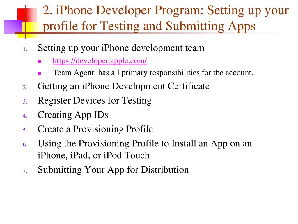 2. iPhone Developer Program: Setting up your profile for Testing and Submitting Apps • Setting up your iPhone development team • https://developer.apple.com/ • Team Agent: has all primary responsibilities for the account. • Getting an iPhone Development Certificate • Register Devices for Testing • Creating App IDs • Create a Provisioning Profile • Using the Provisioning Profile to Install an App on an iPhone, iPad, or iPod Touch • Submitting Your App for Distribution