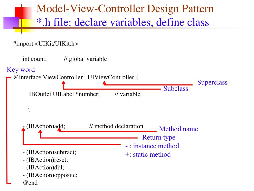 Model-View-Controller Design Pattern*.h file: declare variables, define class #import <UIKit/UIKit.h>int count; // global variable @interface ViewController : UIViewController { IBOutlet UILabel *number; // variable }- (IBAction)add; // method declaration - (IBAction)subtract; - (IBAction)reset; - (IBAction)dbl; - (IBAction)opposite; @end Key word Superclass Subclass Method name Return type - : instance method +: static method