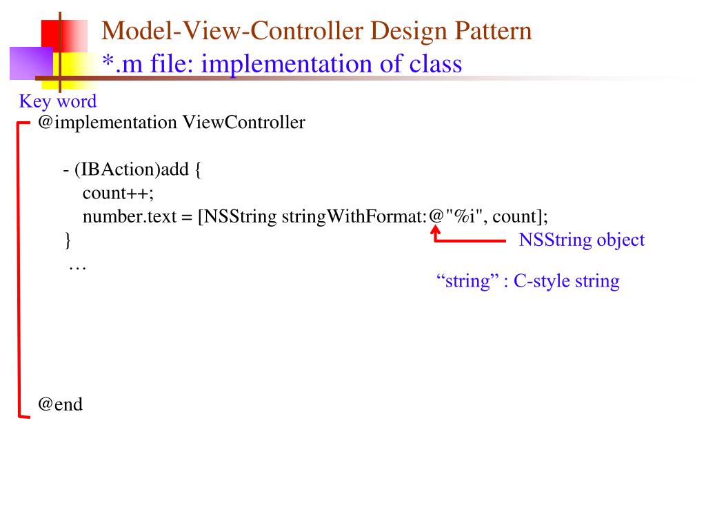 Model-View-Controller Design Pattern*.m file: implementation of class Key word @implementation ViewController- (IBAction)add { count++; number.text = [NSString stringWithFormat:@"%i", count];} … @end NSString object “string” : C-style string