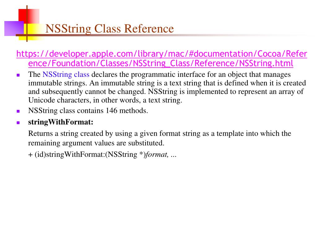 NSString Class Reference https://developer.apple.com/library/mac/#documentation/Cocoa/Reference/Foundation/Classes/NSString_Class/Reference/NSString.html • The NSString class declares the programmatic interface for an object that manages immutable strings. An immutable string is a text string that is defined when it is created and subsequently cannot be changed. NSString is implemented to represent an array of Unicode characters, in other words, a text string. • NSString class contains 146 methods. • stringWithFormat: Returns a string created by using a given format string as a template into which the remaining argument values are substituted. + (id)stringWithFormat:(NSString *)format,...