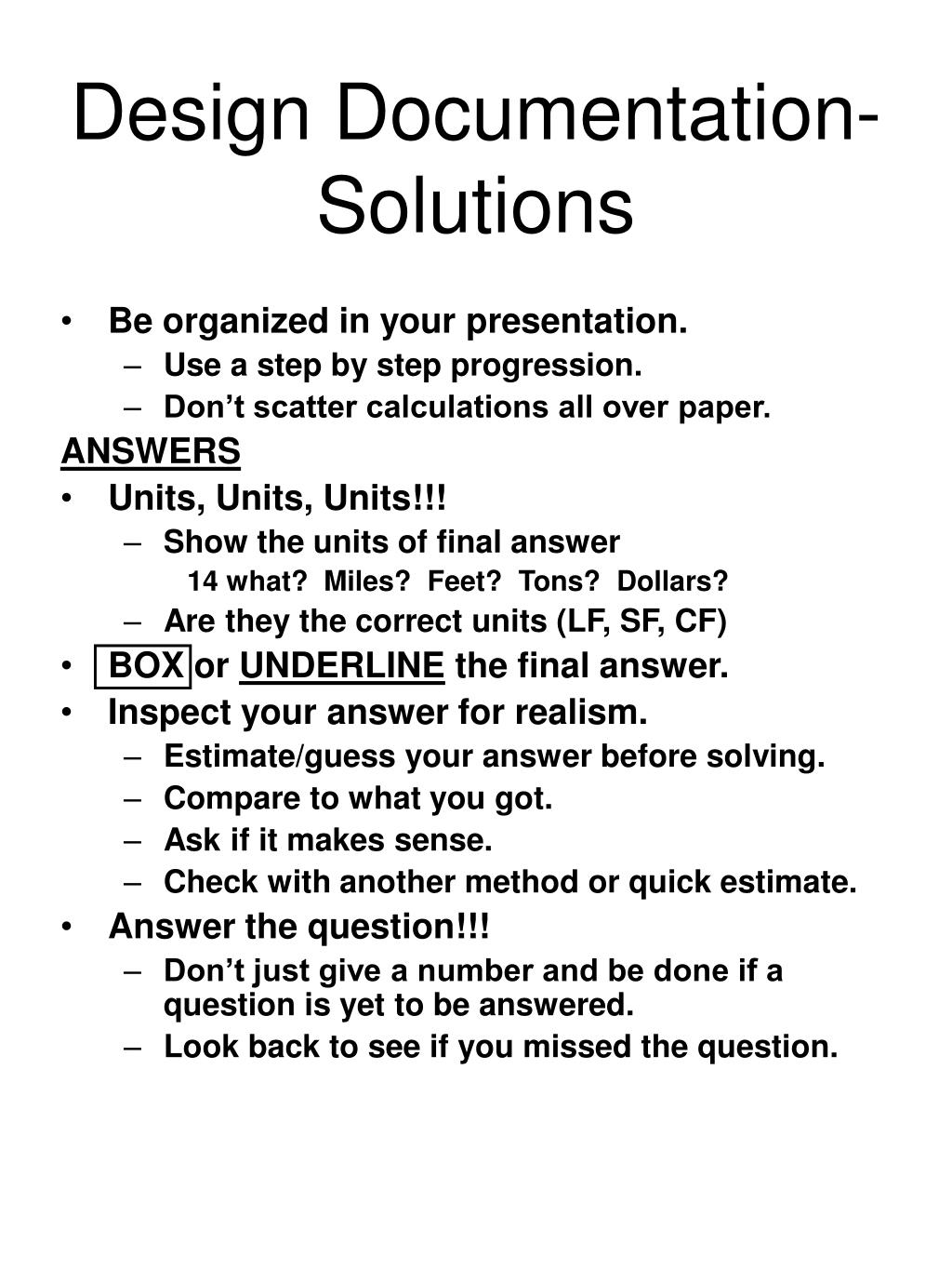 Design Documentation-Solutions • Be organized in your presentation. • Use a step by step progression. • Don’t scatter calculations all over paper. ANSWERS • Units, Units, Units!!! • Show the units of final answer 14 what? Miles? Feet? Tons? Dollars? • Are they the correct units (LF, SF, CF) • BOX or UNDERLINE the final answer. • Inspect your answer for realism. • Estimate/guess your answer before solving. • Compare to what you got. • Ask if it makes sense. • Check with another method or quick estimate. • Answer the question!!! • Don’t just give a number and be done if a question is yet to be answered. • Look back to see if you missed the question.