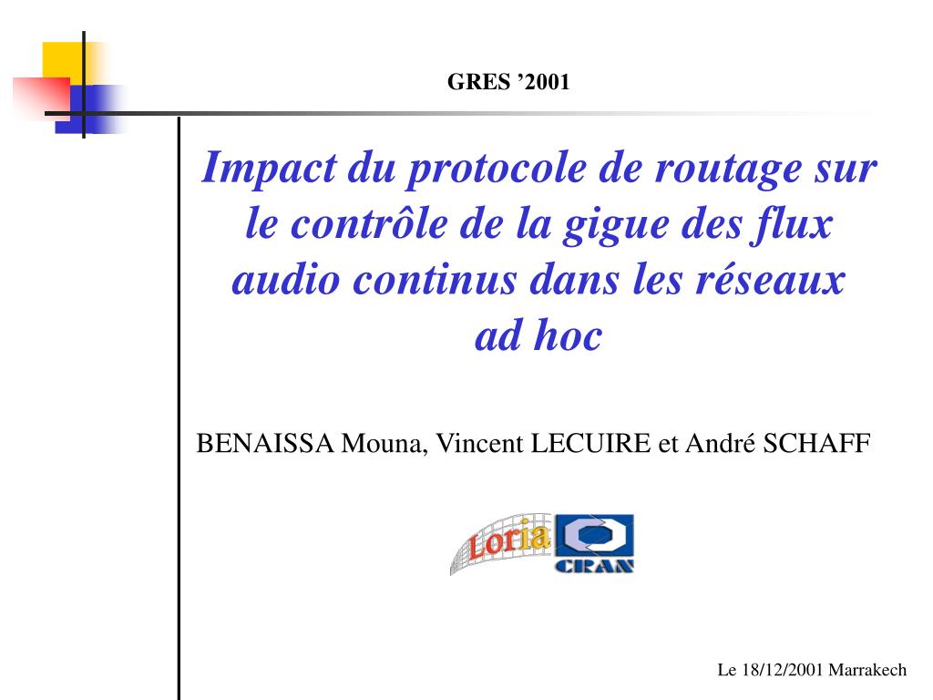 GRES ’2001. Impact du protocole de routage sur le contrôle de la gigue des flux audio continus dans les réseaux ad hoc. BENAISSA Mouna, Vincent LECUIRE et André SCHAFF. Le 18/12/2001 Marrakech. Problématique et motivation. La gigue : variation dans les délais bout-en-bout