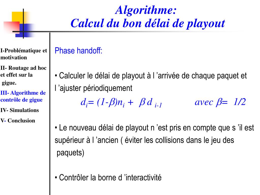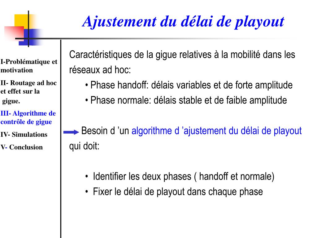 Ajustement du délai de playout • Caractéristiques de la gigue relatives à la mobilité dans les réseaux ad hoc: • Phase handoff: délais variables et de forte amplitude • Phase normale: délais stable et de faible amplitude • Besoin d ’un algorithme d ’ajustement du délai de playout qui doit: • Identifier les deux phases ( handoff et normale) • Fixer le délai de playout dans chaque phase I-Problématique et motivation II- Routage ad hoc et effet sur la gigue. III- Algorithme de contrôle de gigue IV- Simulations V- Conclusion