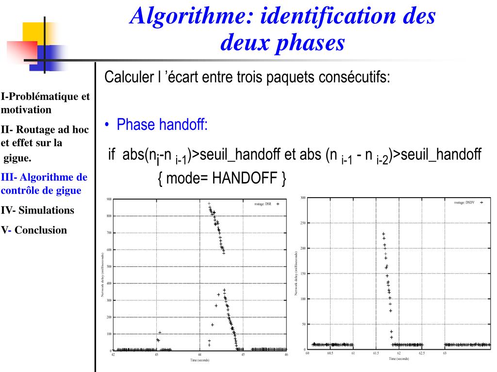 Algorithme: identification des deux phases • Calculer l ’écart entre trois paquets consécutifs: • Phase handoff: • if abs(ni-n i-1)>seuil_handoff et abs (n i-1 - n i-2)>seuil_handoff • { mode= HANDOFF } I-Problématique et motivation II- Routage ad hoc et effet sur la gigue. III- Algorithme de contrôle de gigue IV- Simulations V- Conclusion