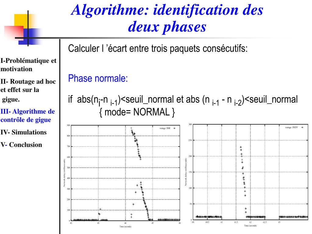 Algorithme: identification des deux phases • Calculer l ’écart entre trois paquets consécutifs: • Phase normale: • if abs(ni-n i-1)<seuil_normal et abs (n i-1 - n i-2)<seuil_normal • { mode= NORMAL } I-Problématique et motivation II- Routage ad hoc et effet sur la gigue. III- Algorithme de contrôle de gigue IV- Simulations V- Conclusion