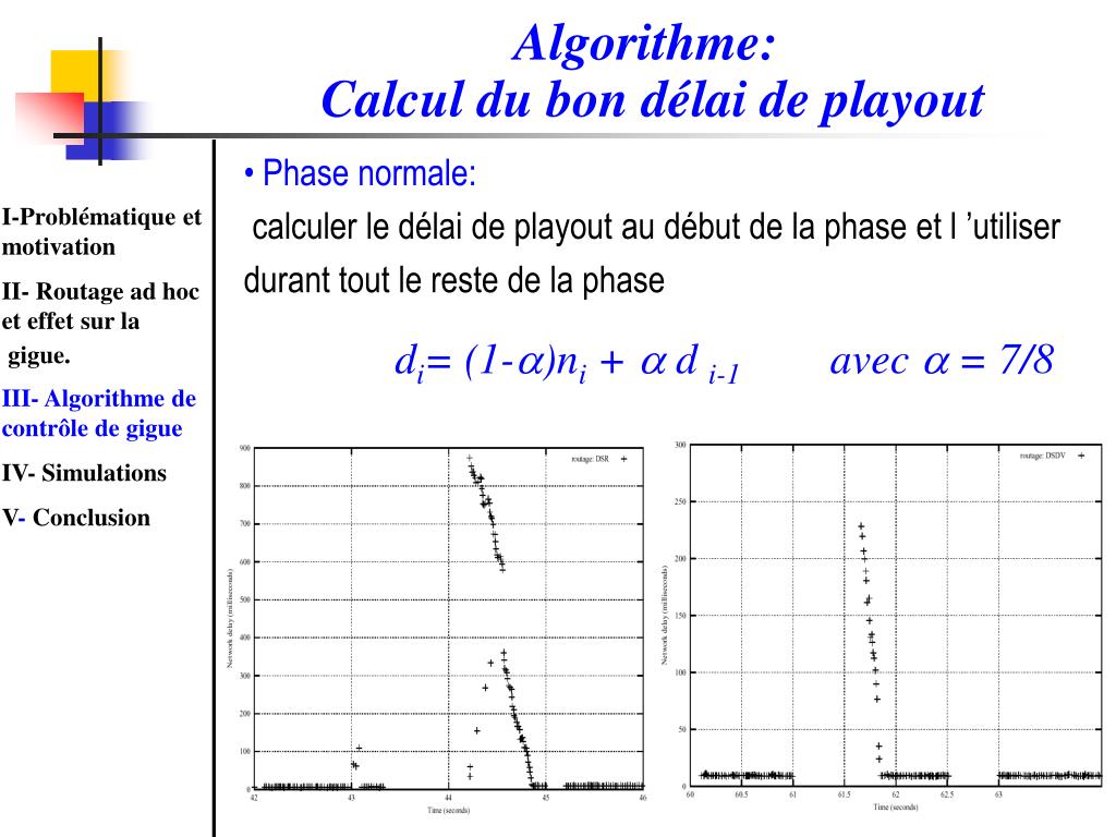 Algorithme: Calcul du bon délai de playout • Phase normale: • calculer le délai de playout au début de la phase et l ’utiliser durant tout le reste de la phase • di= (1-)ni + d i-1 avec = 7/8 I-Problématique et motivation II- Routage ad hoc et effet sur la gigue. III- Algorithme de contrôle de gigue IV- Simulations V- Conclusion