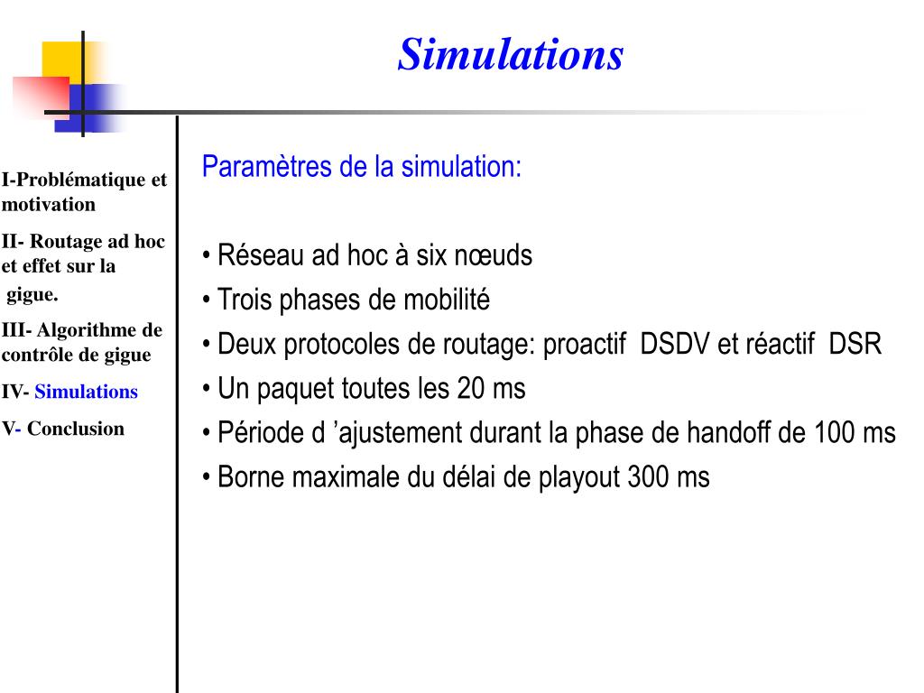Algorithme: Calcul du bon délai de playout • Phase handoff: • Calculer le délai de playout à l ’arrivée de chaque paquet et • l ’ajuster périodiquement • di= (1-)ni + d i-1 avec = 1/2 • Le nouveau délai de playout n ’est pris en compte que s ’il est supérieur à l ’ancien ( éviter les collisions dans le jeu des • paquets) • Contrôler la borne d ’interactivité I-Problématique et motivation II- Routage ad hoc et effet sur la gigue. III- Algorithme de contrôle de gigue IV- Simulations V- Conclusion