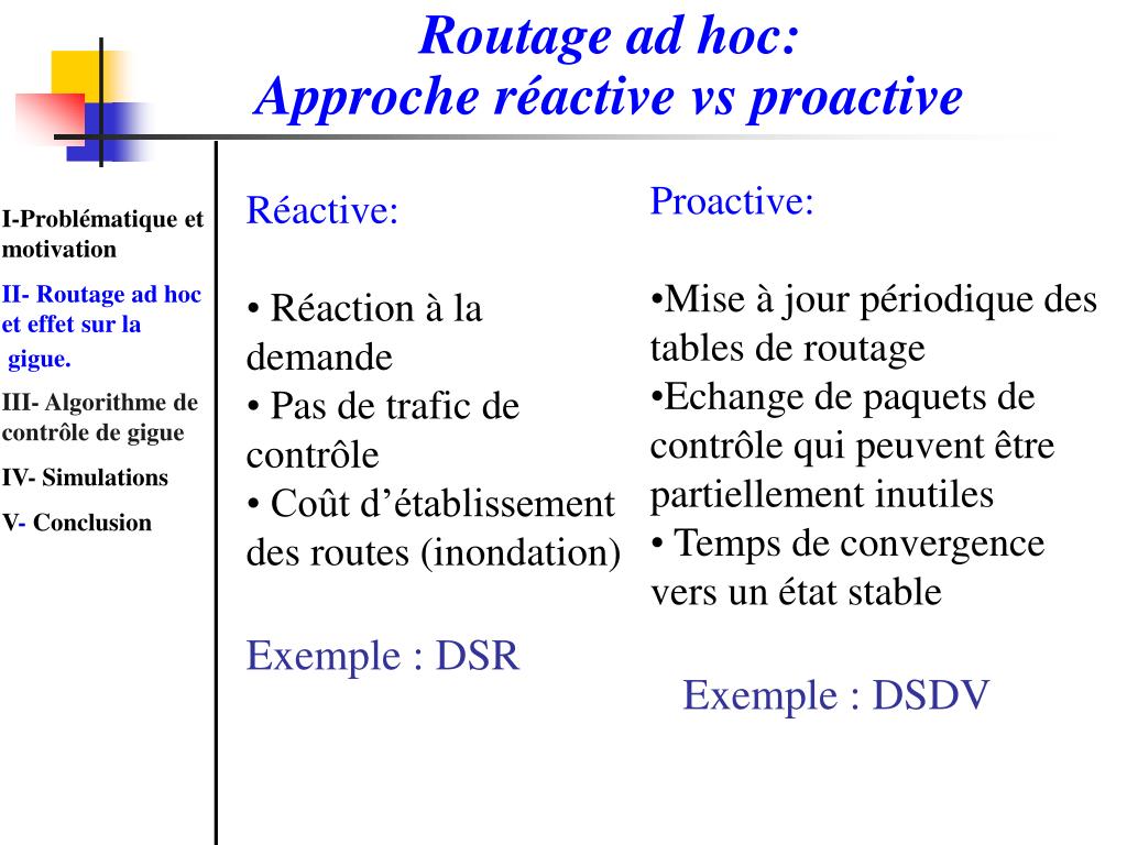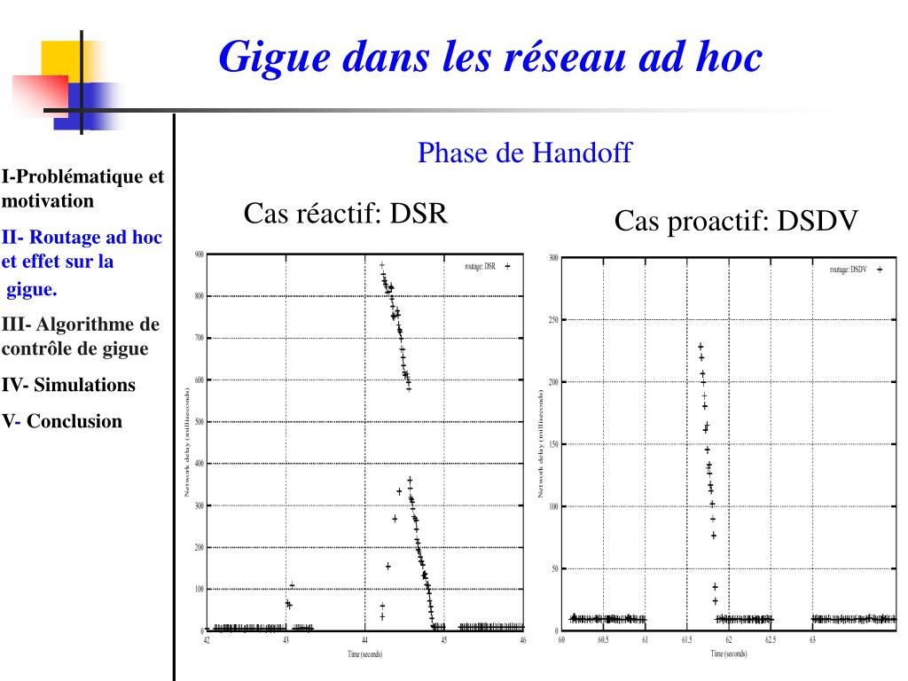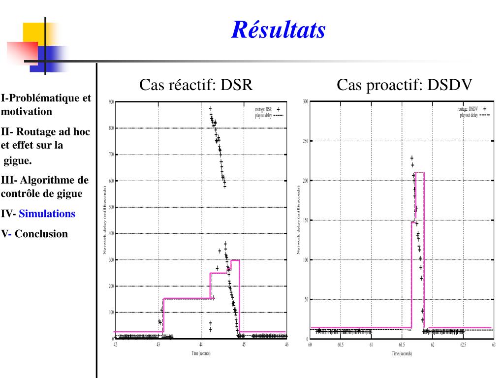 Résultats Cas réactif: DSR Cas proactif: DSDV I-Problématique et motivation II- Routage ad hoc et effet sur la gigue. III- Algorithme de contrôle de gigue IV- Simulations V- Conclusion