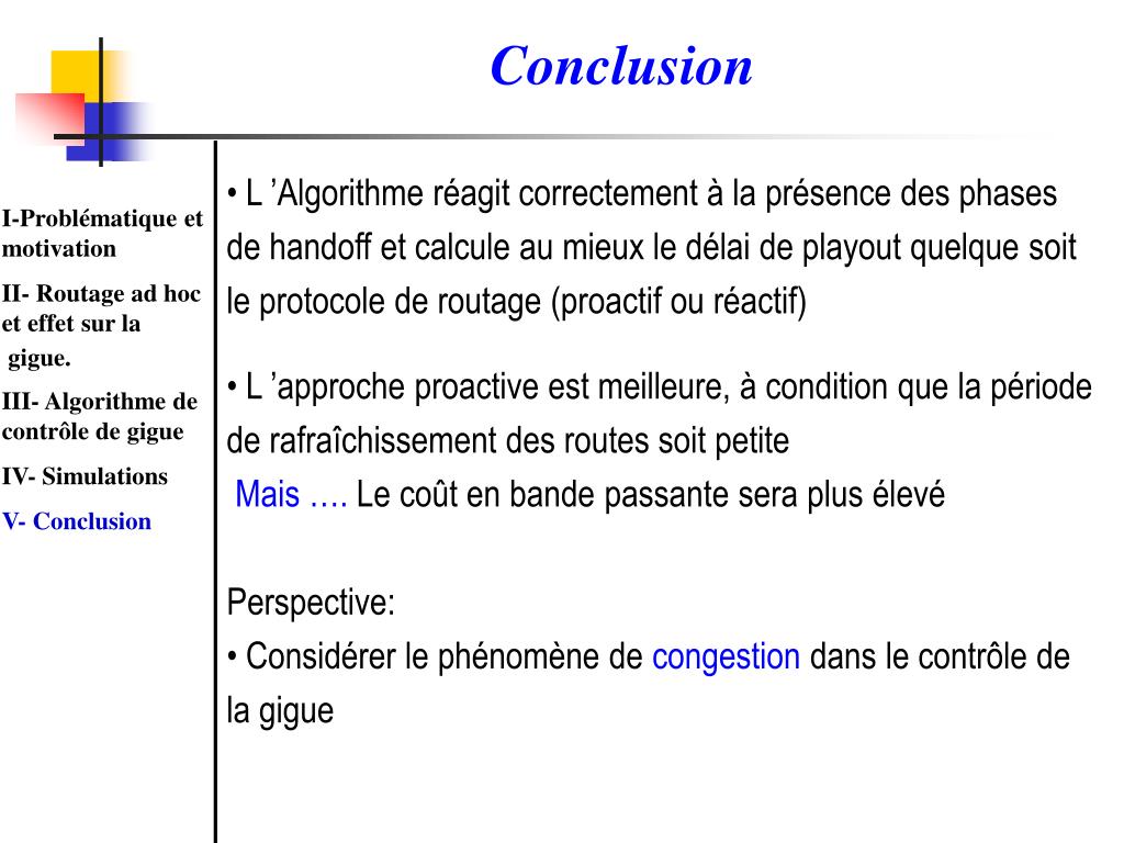 Conclusion • L ’Algorithme réagit correctement à la présence des phases de handoff et calcule au mieux le délai de playout quelque soit le protocole de routage (proactif ou réactif) • L ’approche proactive est meilleure, à condition que la période de rafraîchissement des routes soit petite • Mais …. Le coût en bande passante sera plus élevé • Perspective: • Considérer le phénomène de congestion dans le contrôle de la gigue I-Problématique et motivation II- Routage ad hoc et effet sur la gigue. III- Algorithme de contrôle de gigue IV- Simulations V- Conclusion