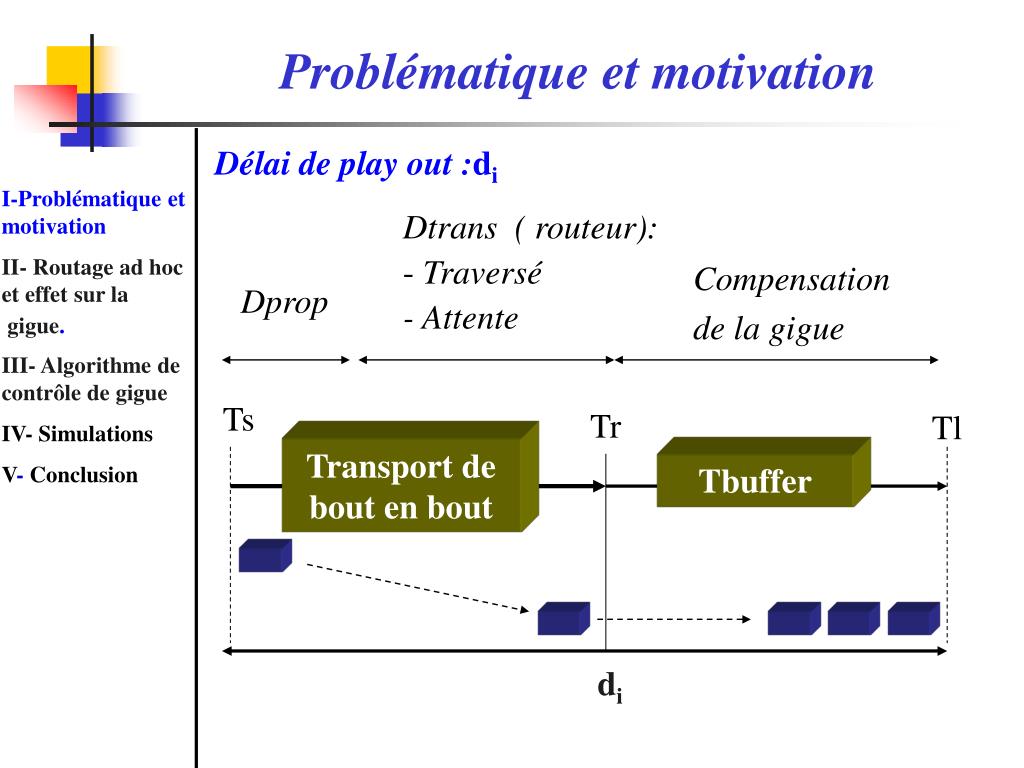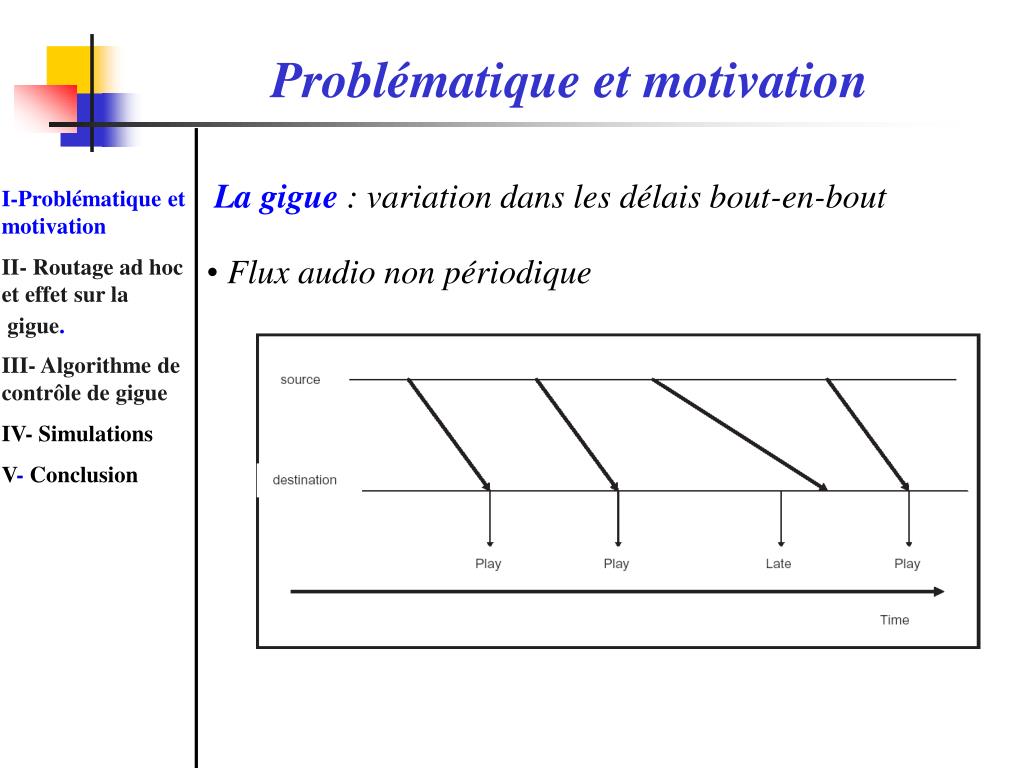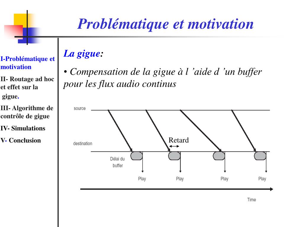 Problématique et motivation • La gigue: • Compensation de la gigue à l ’aide d ’un buffer pour les flux audio continus I-Problématique et motivation II- Routage ad hoc et effet sur la gigue. III- Algorithme de contrôle de gigue IV- Simulations V- Conclusion Retard