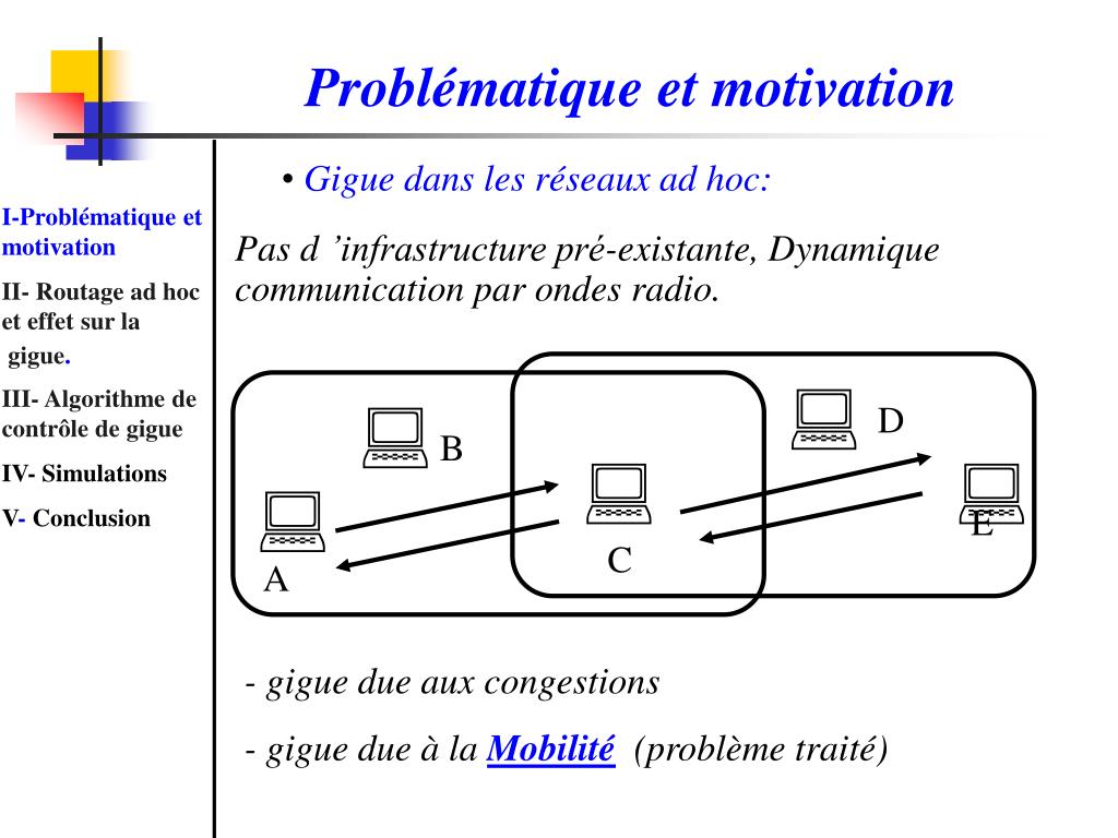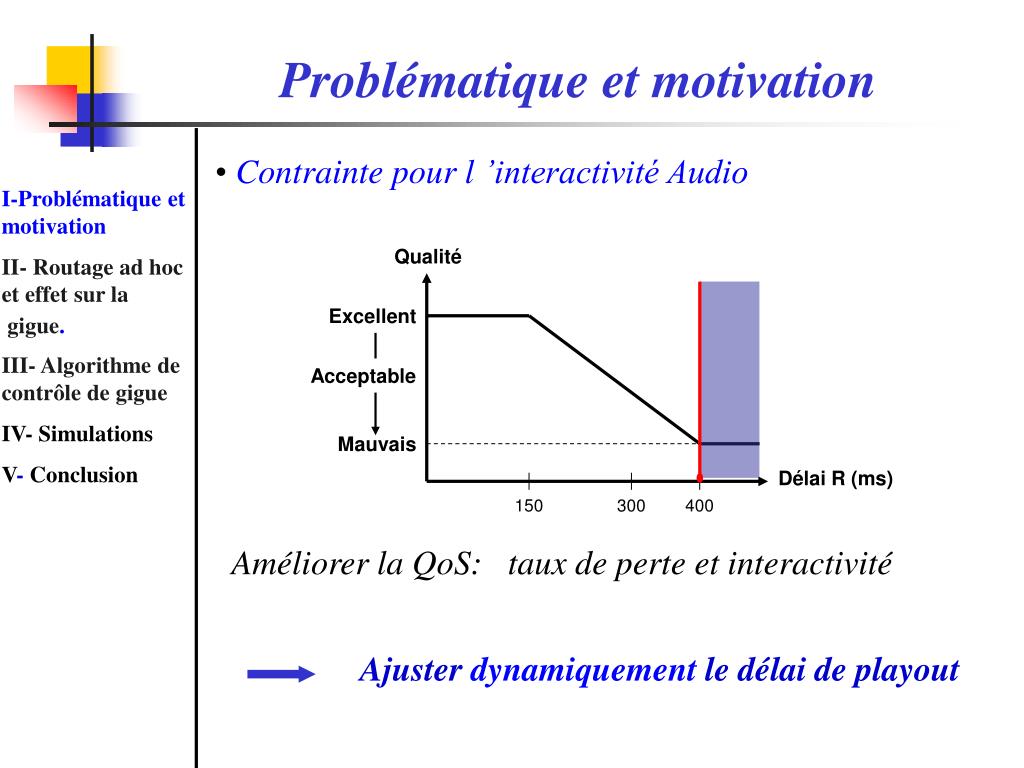 Problématique et motivation • La gigue : variation dans les délais bout-en-bout • Flux audio non périodique I-Problématique et motivation II- Routage ad hoc et effet sur la gigue. III- Algorithme de contrôle de gigue IV- Simulations V- Conclusion