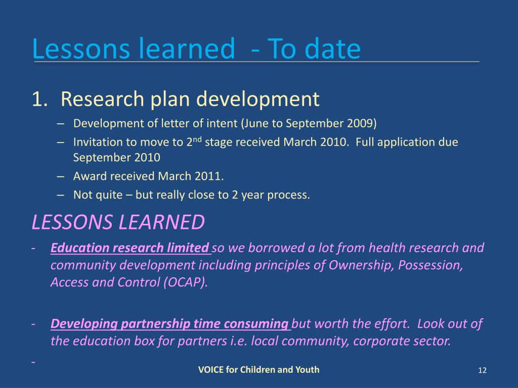 Lessons learned - To date • Research plan development • Development of letter of intent (June to September 2009) • Invitation to move to 2nd stage received March 2010. Full application due September 2010 • Award received March 2011. • Not quite – but really close to 2 year process. LESSONS LEARNED • Education research limited so we borrowed a lot from health research and community development including principles of Ownership, Possession, Access and Control (OCAP). • Developing partnership time consuming but worth the effort. Look out of the education box for partners i.e. local community, corporate sector. VOICE for Children and Youth