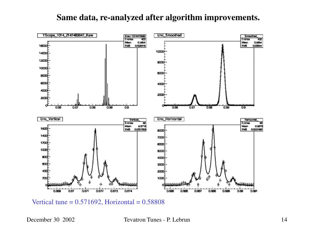 Same data, re-analyzed after algorithm improvements. Vertical tune = 0.571692, Horizontal = 0.58808 Tevatron Tunes - P. Lebrun
