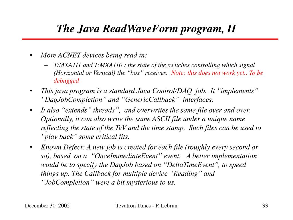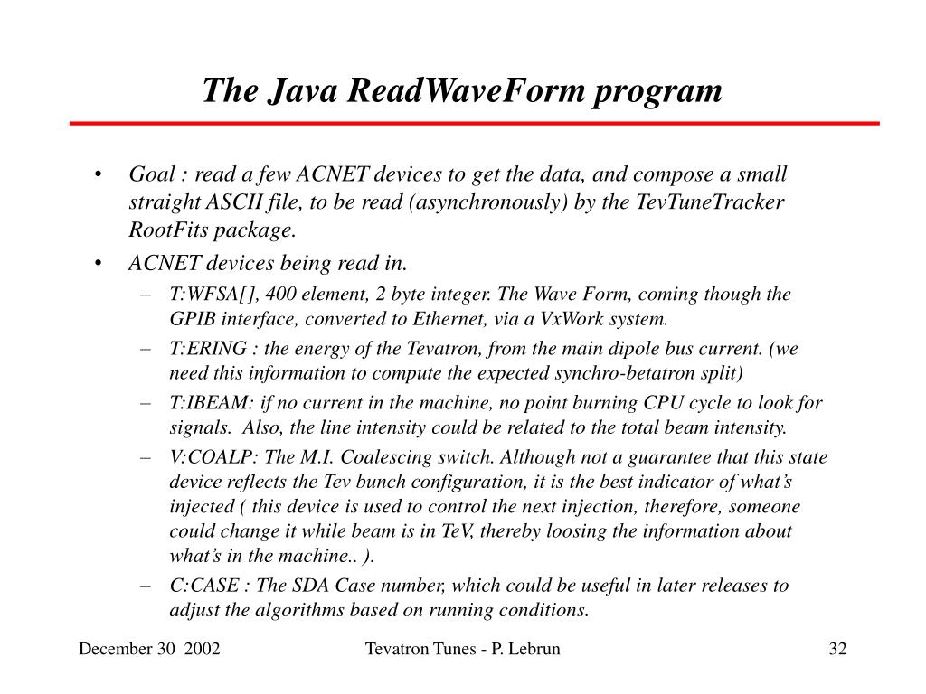 The Java ReadWaveForm program • Goal : read a few ACNET devices to get the data, and compose a small straight ASCII file, to be read (asynchronously) by the TevTuneTracker RootFits package. • ACNET devices being read in. • T:WFSA[], 400 element, 2 byte integer. The Wave Form, coming though the GPIB interface, converted to Ethernet, via a VxWork system. • T:ERING : the energy of the Tevatron, from the main dipole bus current. (we need this information to compute the expected synchro-betatron split) • T:IBEAM: if no current in the machine, no point burning CPU cycle to look for signals. Also, the line intensity could be related to the total beam intensity. • V:COALP: The M.I. Coalescing switch. Although not a guarantee that this state device reflects the Tev bunch configuration, it is the best indicator of what’s injected ( this device is used to control the next injection, therefore, someone could change it while beam is in TeV, thereby loosing the information about what’s in the machine.. ). • C:CASE : The SDA Case number, which could be useful in later releases to adjust the algorithms based on running conditions. Tevatron Tunes - P. Lebrun