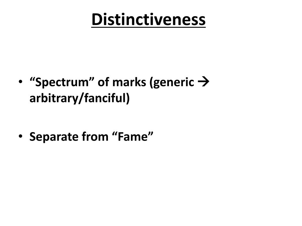 Distinctiveness • “Spectrum” of marks (generic arbitrary/fanciful) • Separate from “Fame”