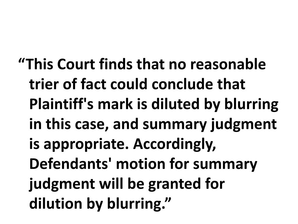 Dilution/Parody “[T]he Second Circuit and its district courts have held on numerous occasions that in the case of parody, “the use of famous marks in parodies causes no loss of distinctiveness, since the success of the use depends upon the continued association with the plaintiff.”