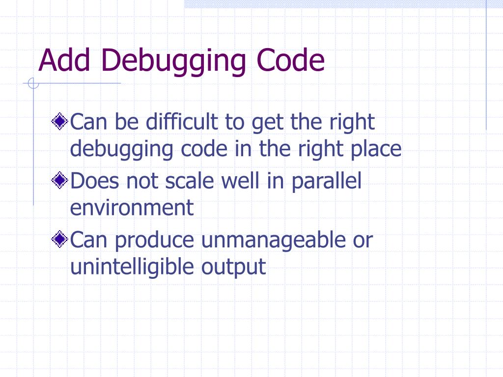 Add Debugging Code • Can be difficult to get the right debugging code in the right place • Does not scale well in parallel environment • Can produce unmanageable or unintelligible output
