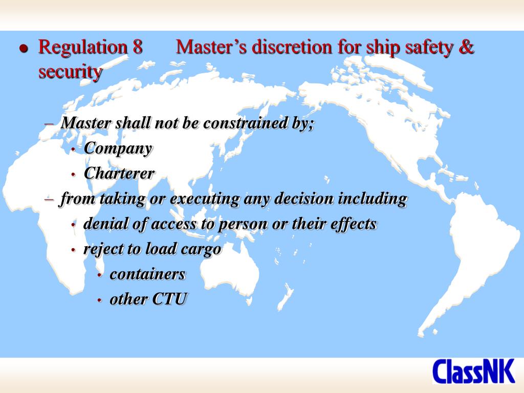 Regulation 8 Master’s discretion for ship safety & security • Master shall not be constrained by; • Company • Charterer • from taking or executing any decision including • denial of access to person or their effects • reject to load cargo • containers • other CTU