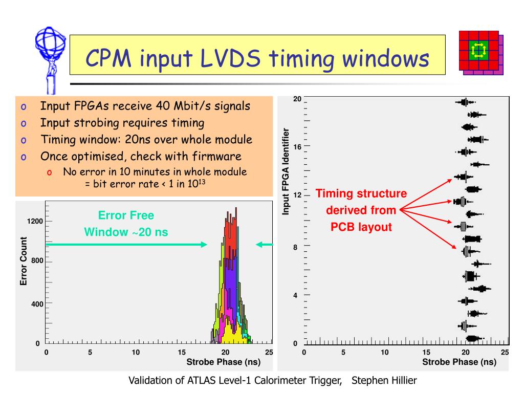 CPM input LVDS timing windows 20 • Input FPGAs receive 40 Mbit/s signals • Input strobing requires timing • Timing window: 20ns over whole module • Once optimised, check with firmware • No error in 10 minutes in whole module = bit error rate < 1 in 1013 16 Input FPGA Identifier Timing structure derived from PCB layout 12 Error Free Window ~20 ns 1200 8 800 Error Count 4 400 0 0 0 5 10 15 20 25 0 5 10 15 20 25 Strobe Phase (ns) Strobe Phase (ns) Validation of ATLAS Level-1 Calorimeter Trigger, Stephen Hillier