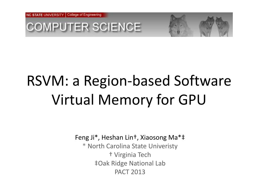 RSVM: a Region-based Software Virtual Memory for GPU FengJi*, Heshan Lin†, XiaosongMa*‡ * North Carolina State Univeristy † Virginia Tech ‡Oak Ridge National Lab PACT 2013
