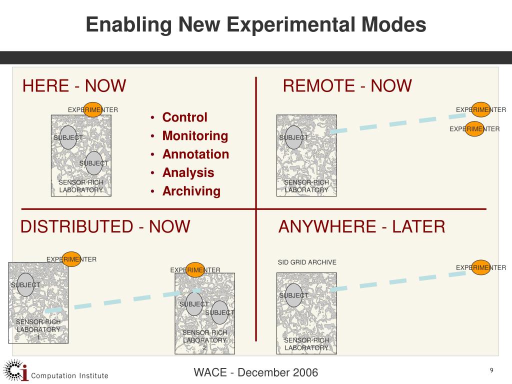 Enabling New Experimental Modes EXPERIMENTER EXPERIMENTER SENSOR-RICH LABORATORY SENSOR-RICH LABORATORY EXPERIMENTER SUBJECT SUBJECT SUBJECT SID GRID ARCHIVE EXPERIMENTER SENSOR-RICH LABORATORY EXPERIMENTER SUBJECT SENSOR-RICH LABORATORY 1 EXPERIMENTER SUBJECT SENSOR-RICH LABORATORY 2 SUBJECT SUBJECT HERE - NOW REMOTE - NOW • Control • Monitoring • Annotation • Analysis • Archiving DISTRIBUTED - NOW ANYWHERE - LATER