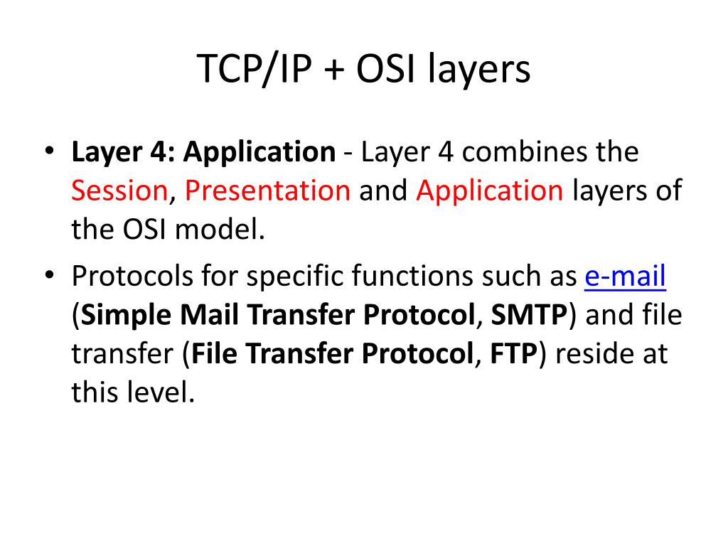 TCP/IP + OSI layers • Layer 4: Application - Layer 4 combines the Session, Presentation and Application layers of the OSI model. • Protocols for specific functions such as e-mail (Simple Mail Transfer Protocol, SMTP) and file transfer (File Transfer Protocol, FTP) reside at this level.